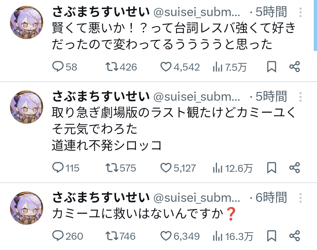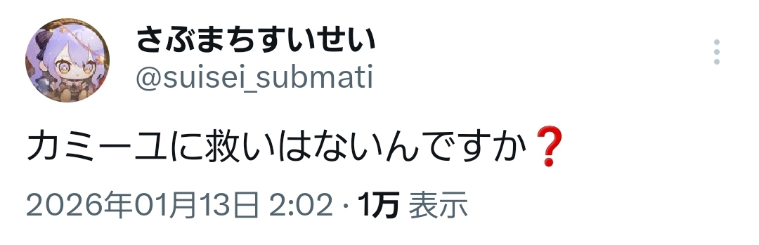 | … | 528無題Name名無し 26/01/13(火)12:37:08 IP:59.132.*(au-net.ne.jp)No.11374238そうだねx3 1768275428048.png-(779281 B) 水宮枢「じ・・・」 |
