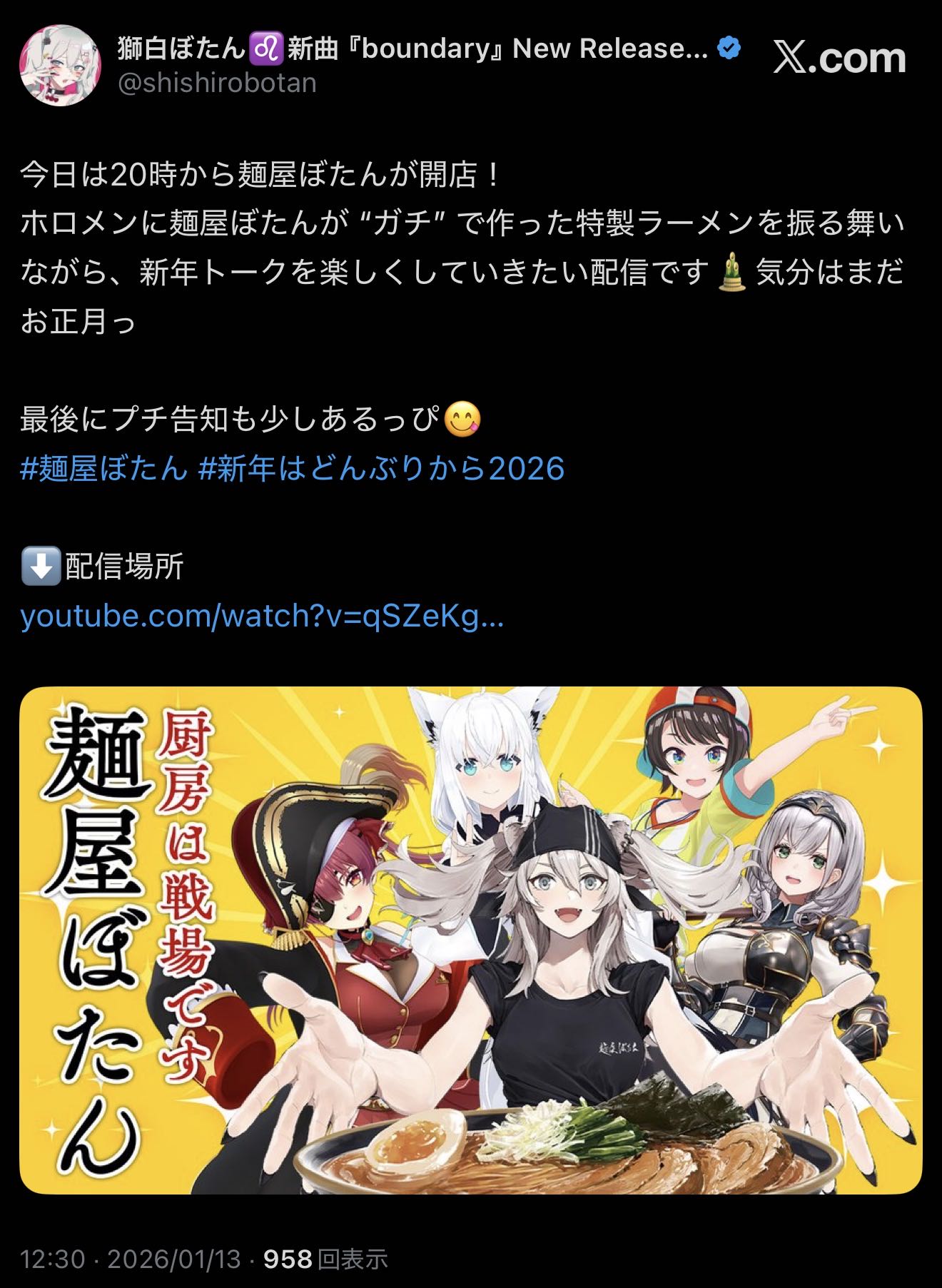 | … | 533無題Name名無し 26/01/13(火)13:29:58 IP:211.124.*(zaq.ne.jp)No.11374255+さすがにラーメン関係の何かが形になりました告知な気がする |