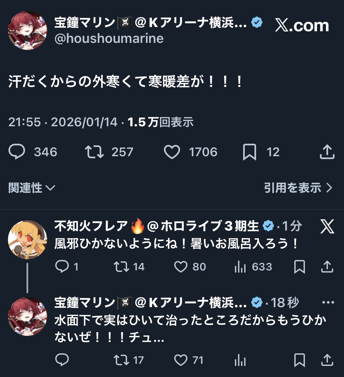 | … | 920無題Name名無し 26/01/14(水)22:41:07 IP:114.159.*(ocn.ne.jp)No.11381126+こよ役満チャンスじゃん |