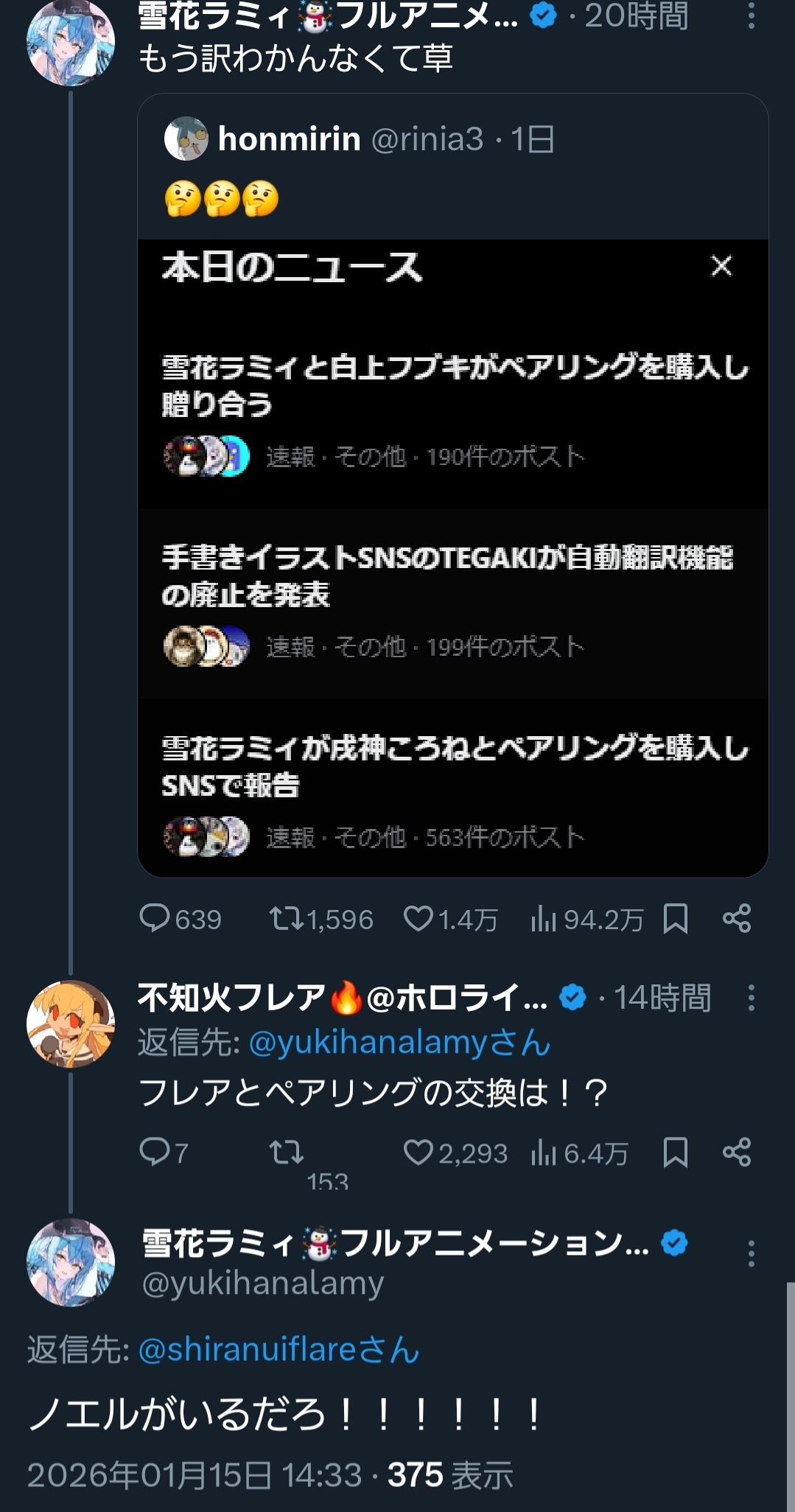| … | 15無題Name名無し 26/01/15(木)10:27:49 IP:133.106.*(ipv4)No.11382293+ 1768440469302.jpg-(50119 B) >>そんな…べーちゃんが昔ホロメンの間で開戦をやってたのに… |