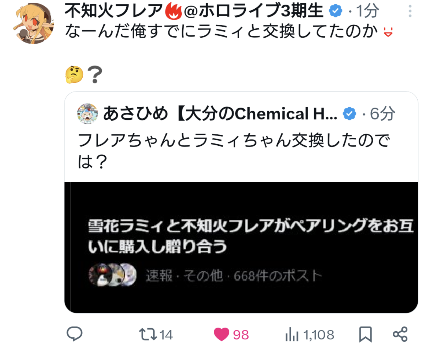 | … | 2無題Name名無し 26/01/15(木)10:14:26 IP:133.106.*(ipv4)No.11382277+ 1768439666437.jpg-(303085 B) そんな…べーちゃんが昔ホロメンの間で開戦をやってたのに… |
