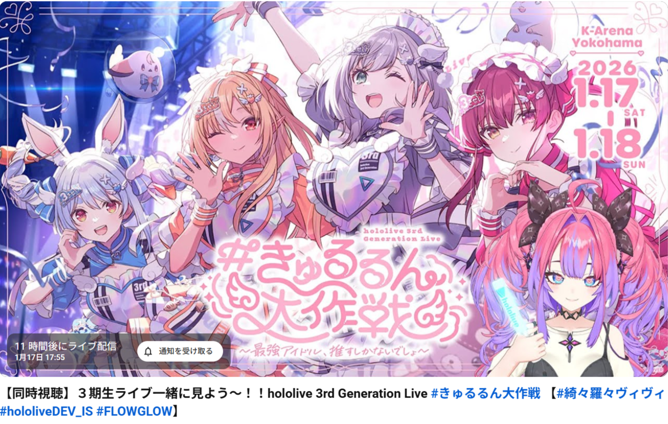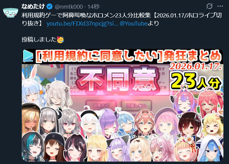 | … | 997無題Name名無し 26/01/17(土)10:13:40 IP:106.72.*(enabler.ne.jp)No.11390916+睡眠しながらホロライブの配信見れるシステムをYAGOOさん福田さん開発してください |