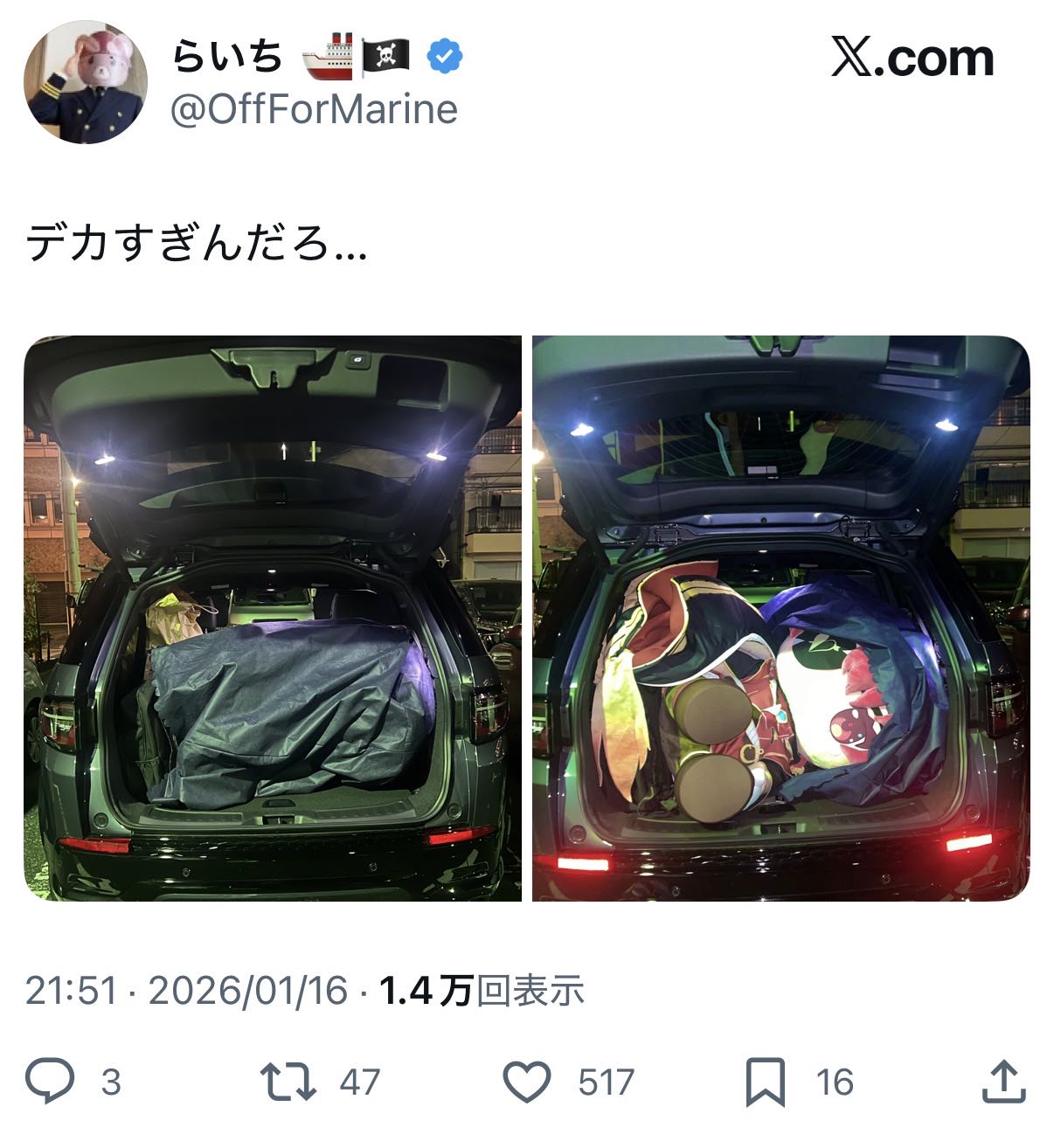 | … | 923無題Name名無し 26/01/17(土)09:55:13 IP:106.72.*(enabler.ne.jp)No.11390838+車窃盗犯もデカい船長居たらビビって逃げるから… |
