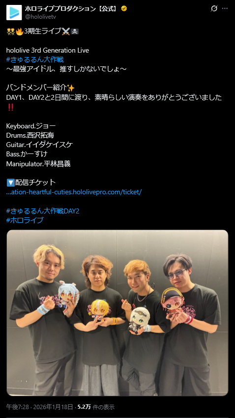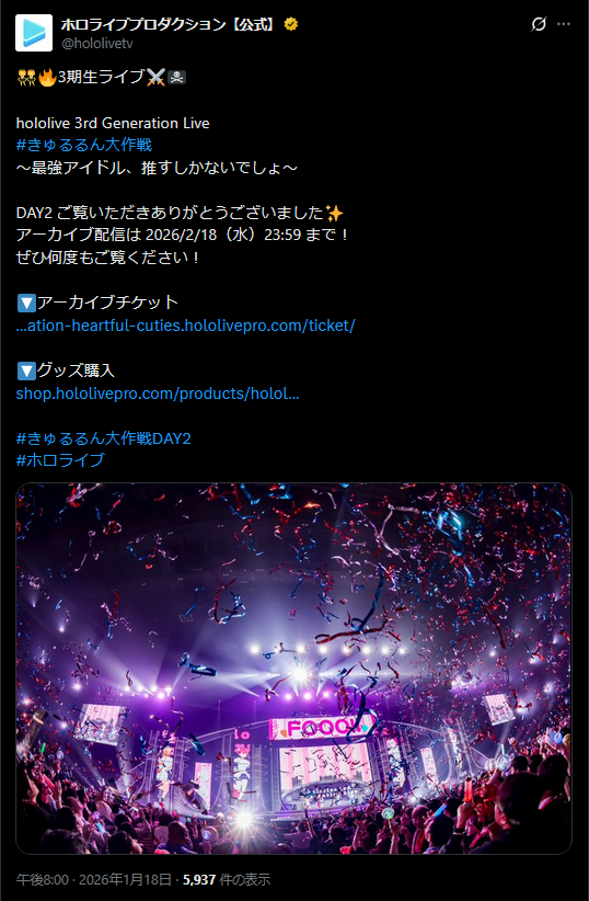 | … | 823無題Name名無し 26/01/20(火)14:24:02 IP:159.28.*(so-net.ne.jp)No.11406764+day2は現地に居たから配信チケットは買って無かったけどヴィヴィがアーカイブ同時視聴するみたいだからやっぱ買うか…ってなってる |