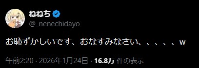 | … | 56無題Name名無し 26/01/24(土)20:15:22 IP:116.70.*(j-cnet.jp)No.11425887+大丈夫?ねねち替え歌してない? |