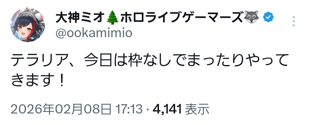 | … | 916無題Name名無し 26/02/08(日)17:36:29 IP:220.144.*(mesh.ad.jp)No.11501587+ 1770539789808.png-(1496396 B) トワ様の珍しい雑談(約1ヵ月ぶり) |
