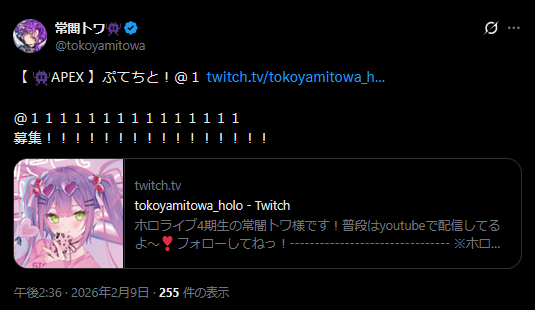 | … | 969無題Name名無し 26/02/09(月)19:04:24 IP:133.200.*(mesh.ad.jp)No.11504913+今夜も配信が多い |