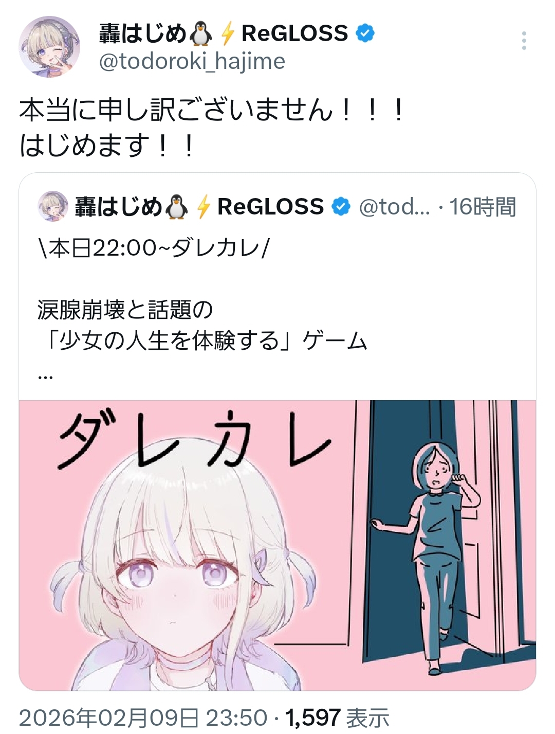 | … | 958無題Name名無し 26/02/10(火)18:24:50 IP:106.146.*(au-net.ne.jp)No.11508165+ホロテラリア明日で最終回か… |