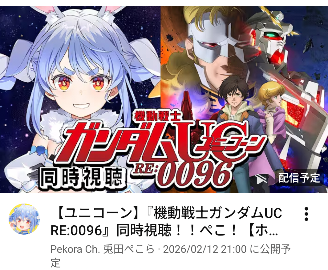 | … | 929無題Name名無し 26/02/10(火)16:52:00 IP:121.81.*(eonet.ne.jp)No.11508109+ぺこちゃんって逆シャアまでの履修はしてる? |