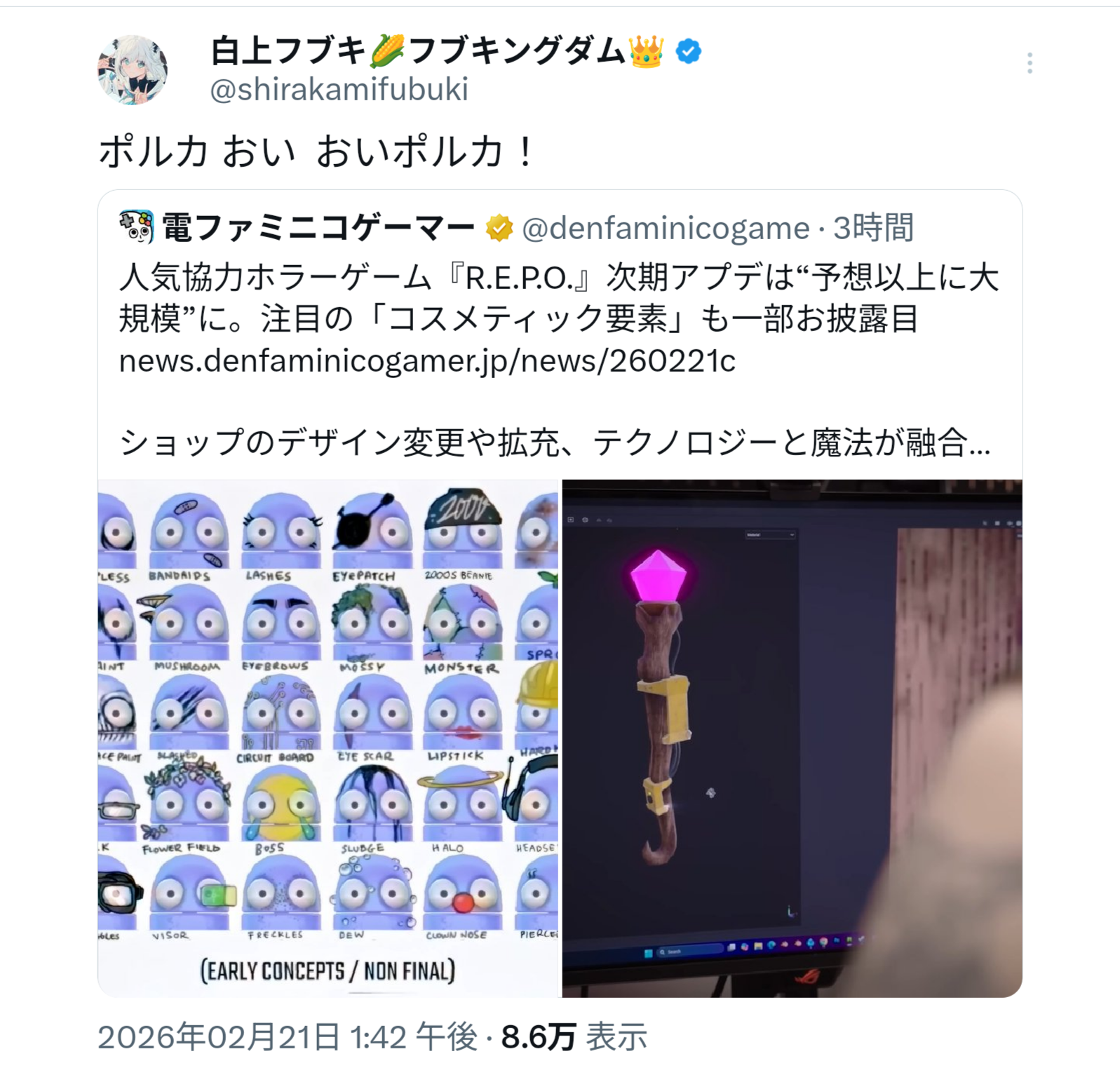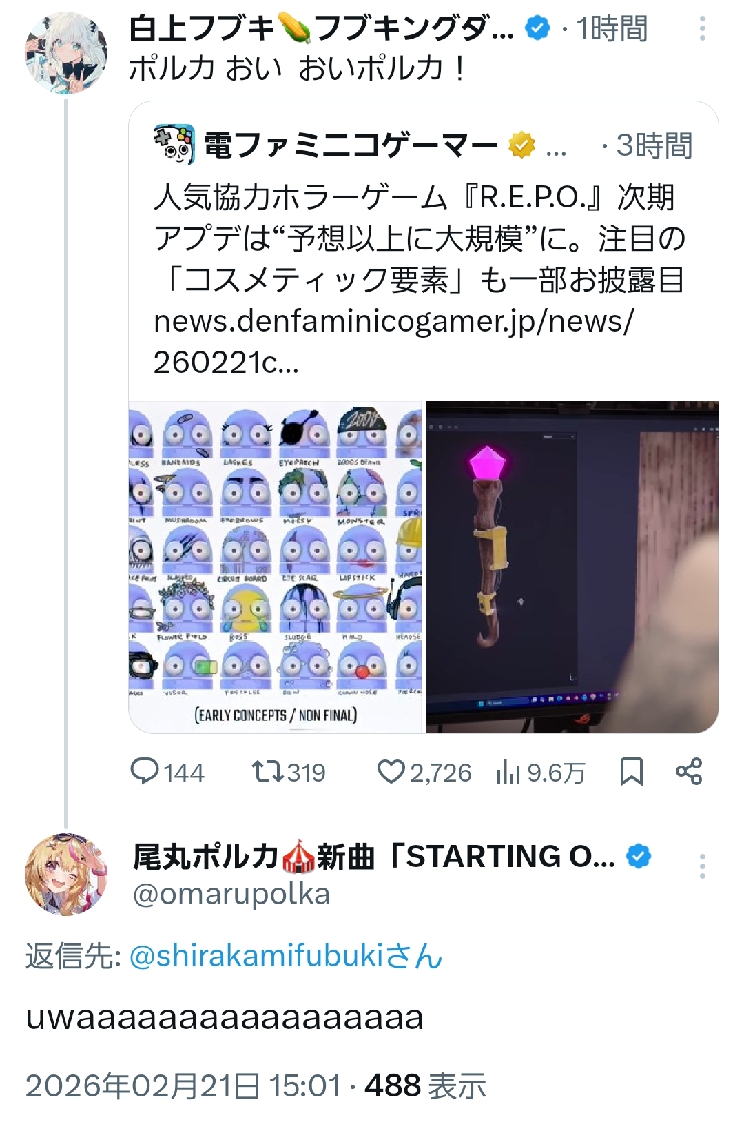 | … | 10無題Name名無し 26/02/21(土)14:44:32 IP:180.145.*(eonet.ne.jp)No.11564226+ポルカ先輩!どうなんですか!? |