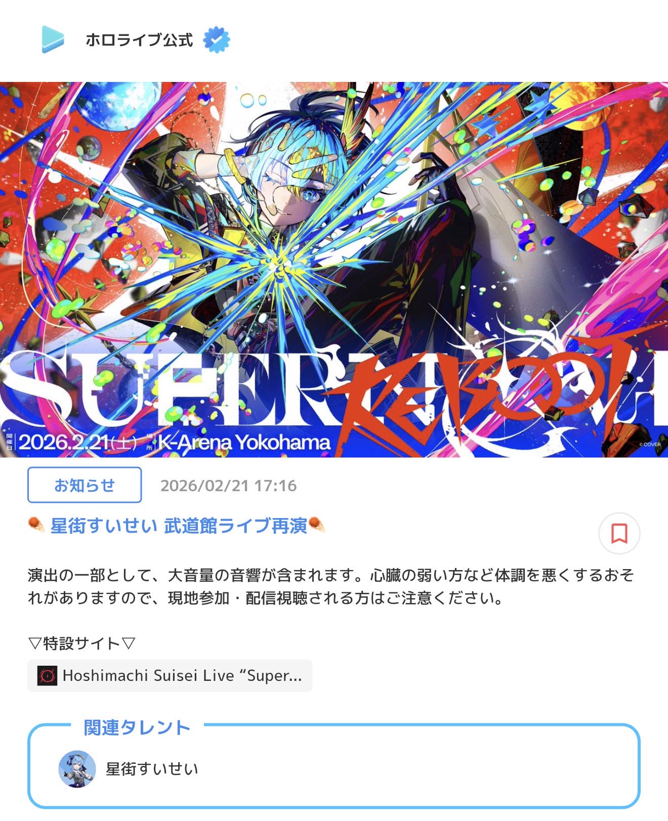 | … | 920無題Name名無し 26/02/21(土)17:31:08 IP:59.146.*(nuro.jp)No.11565187+【チラ見せ】Hoshimachi Suisei Live "SuperNova: REBOOT" |