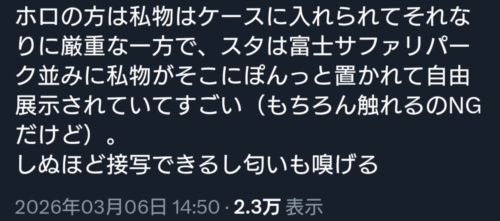| … | 91無題Name名無し 26/03/06(金)21:15:25 IP:133.106.*(ipv4)No.11635798そうだねx1ホロリスお部屋拝見で「あれ?こんなグッズ出してたっけ!?」ってなるのと同じパターン |