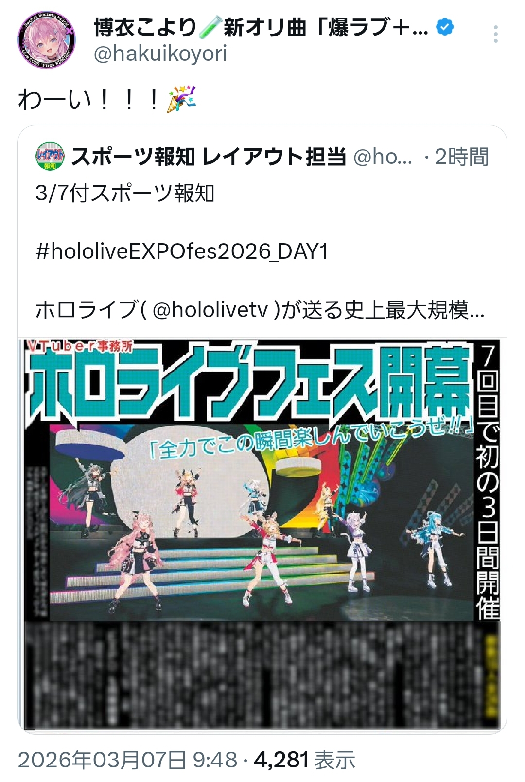 | … | 747無題Name名無し 26/03/07(土)11:36:19 IP:49.98.*(spmode.ne.jp)No.11637830+>このあとEXPO配信はフェスまで何もないんだっけ? |