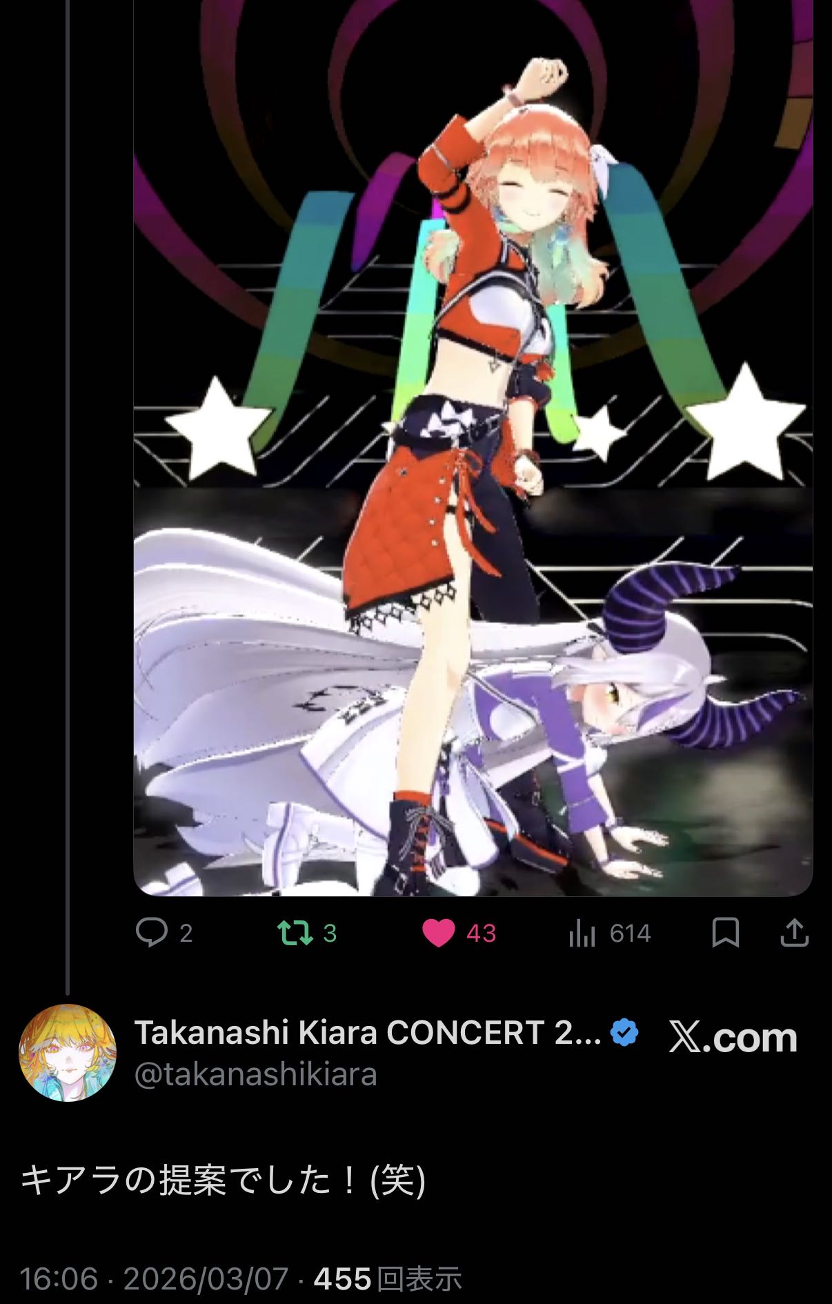 | … | 502無題Name名無し 26/03/07(土)15:27:06 IP:60.107.*(bbtec.net)No.11642397+>ラプ様がギター捨てたところでみんな爆笑してました |