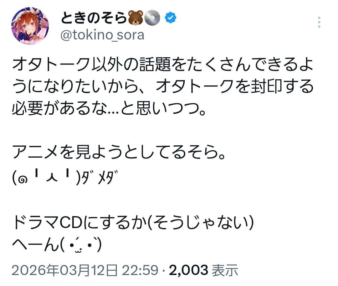 | … | 940無題Name名無し 26/03/12(木)23:08:45 IP:106.146.*(au-net.ne.jp)No.11676577+>ホロライブもボイスとは別にドラマCDみたいなのやれば⋯ |