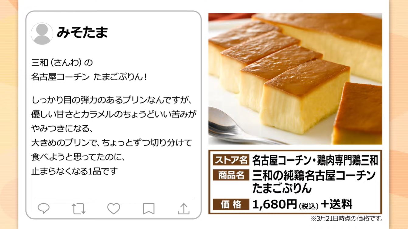 | … | 955無題Name名無し 26/03/21(土)20:21:01 IP:180.92.*(c3-net.ne.jp)No.11725522+名古屋コーチンのお店結構出てるけどプリンは置いてないから珍しいな |