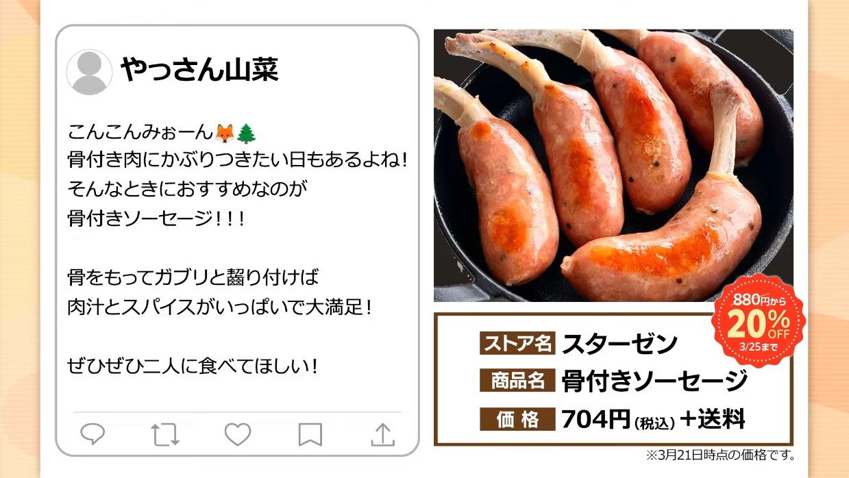 | … | 960無題Name名無し 26/03/21(土)20:21:26 IP:60.98.*(bbtec.net)No.11725527+スターゼンのソーセージ良いよね… |