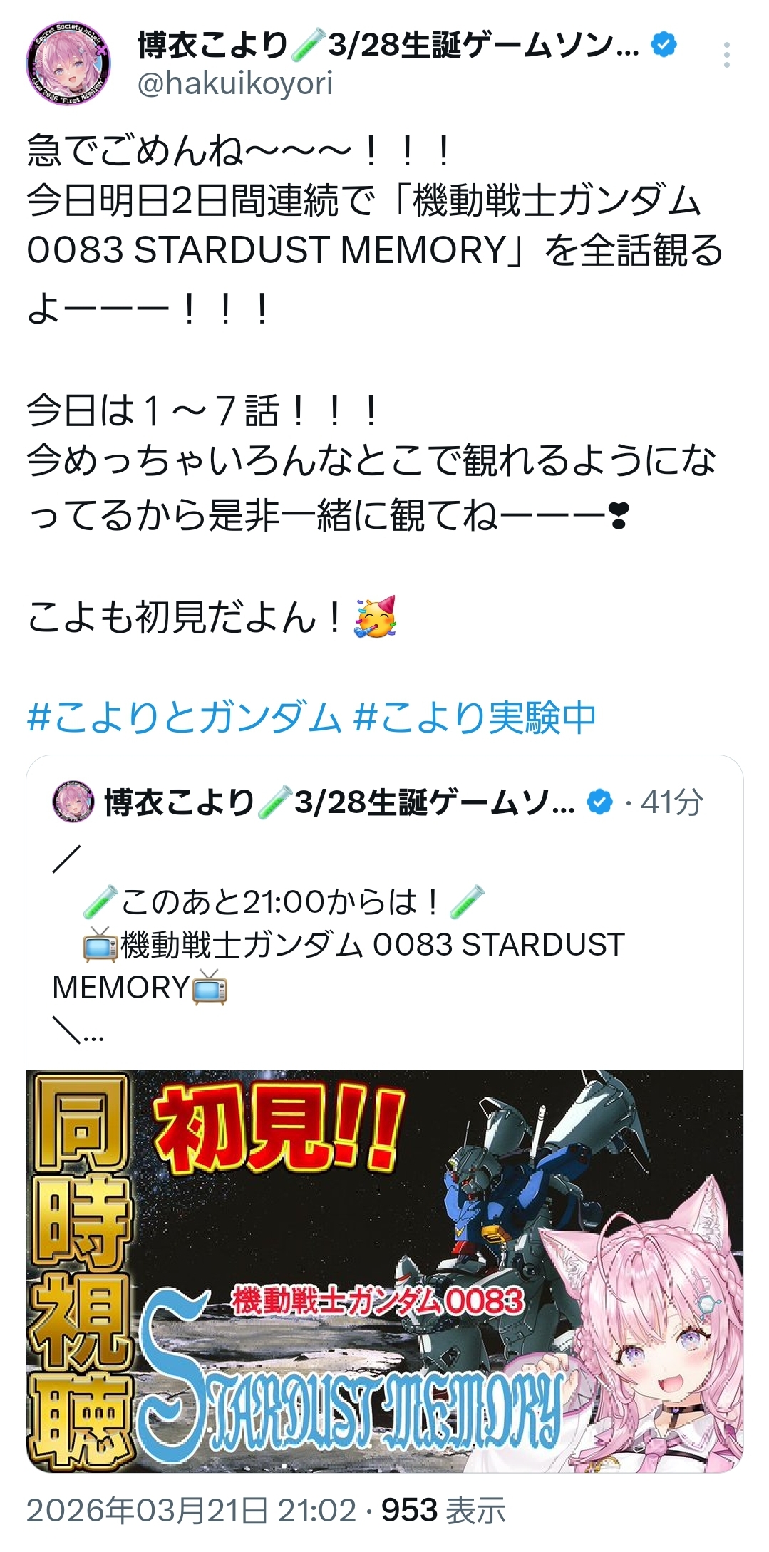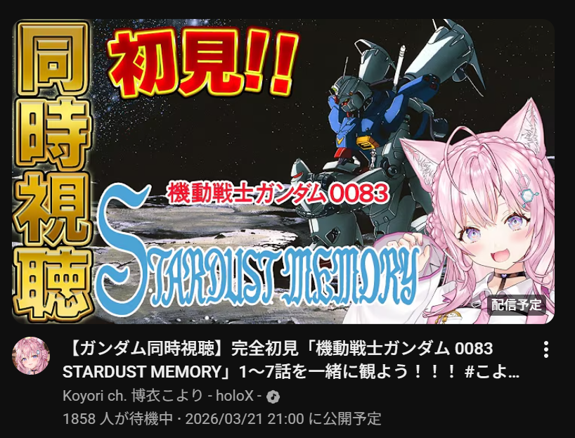 | … | 74無題Name名無し 26/03/21(土)20:30:54 IP:115.31.*(pikara.ne.jp)No.11725646+>>え?21時にこんこよのガンダム0083枠がいつの間にかあるんですケード |