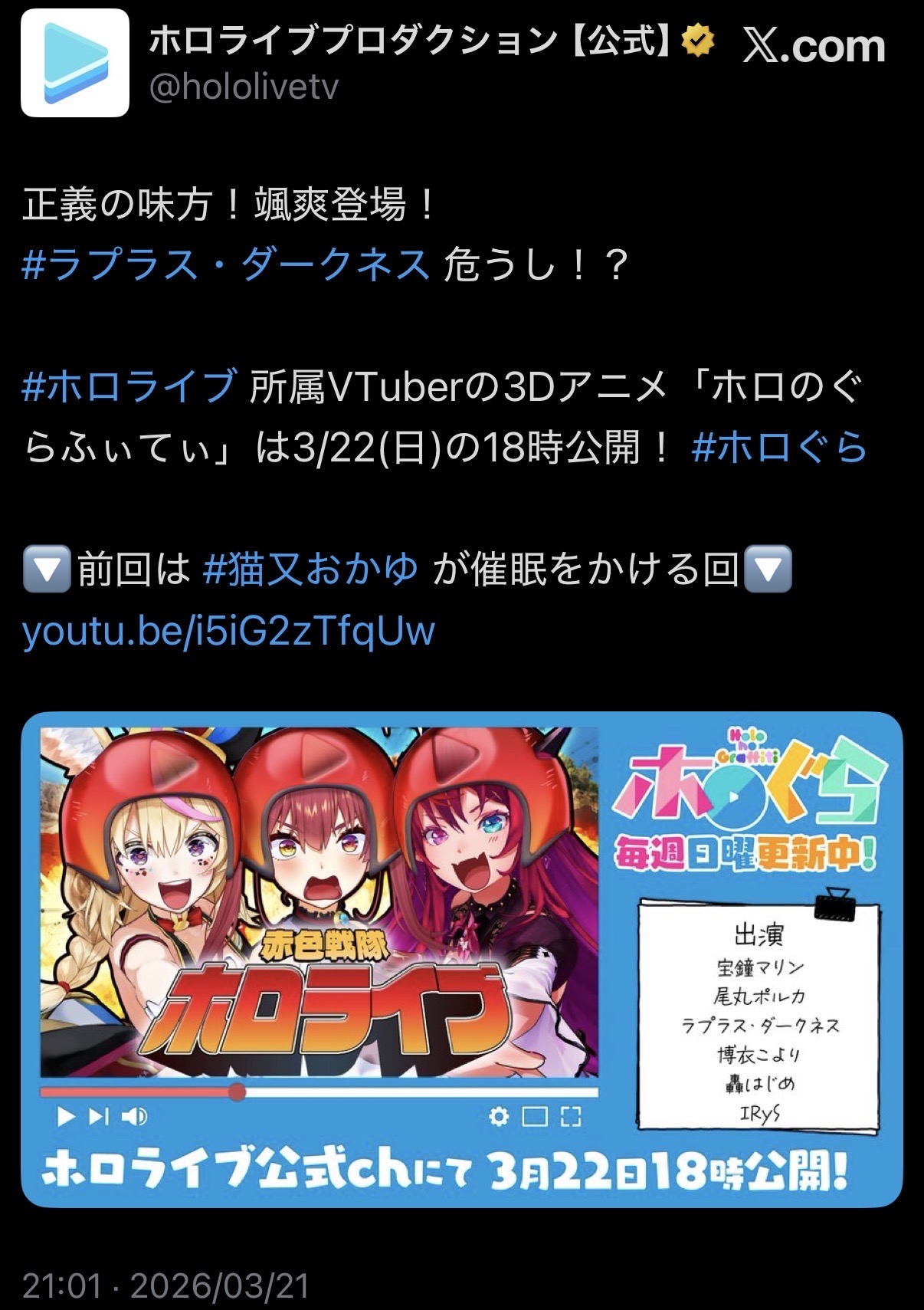 | … | 918無題Name名無し 26/03/21(土)21:12:06 IP:36.13.*(dion.ne.jp)No.11726504+ホロメンとはぜひサンダーボルトを見たいんだよなぁ |
