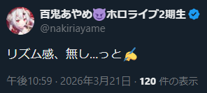 | … | 990無題Name名無し 26/03/21(土)23:50:47 IP:153.188.*(ocn.ne.jp)No.11728645そうだねx5アホかとは言いますがね星街さん |