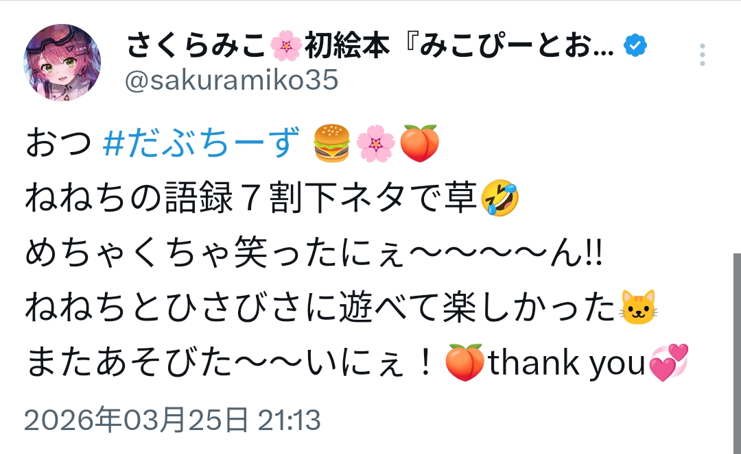 | … | 91無題Name名無し 26/03/25(水)20:49:36 IP:111.169.*(mesh.ad.jp)No.11748486+みこちなのにぇん |