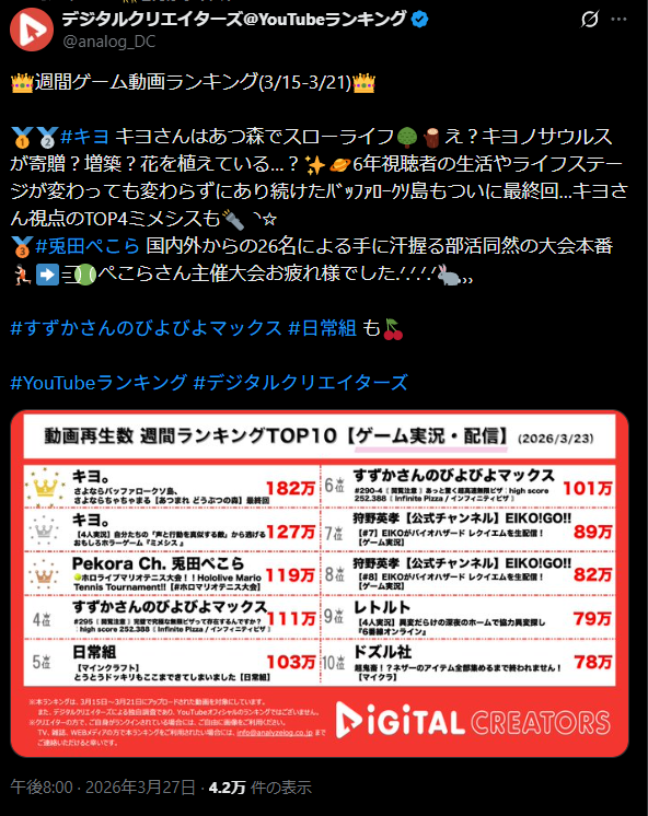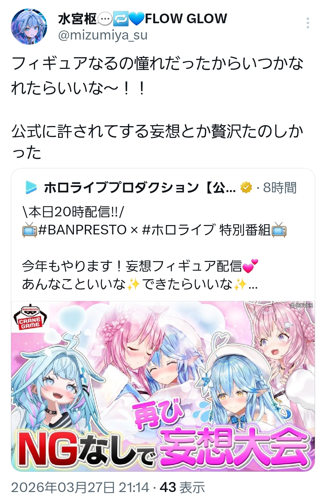 | … | 40無題Name名無し 26/03/27(金)20:47:30 IP:101.203.*(ncv.jp)No.11758054そうだねx2この配信中にすうちゃんの名言が10個くらい出てそう |