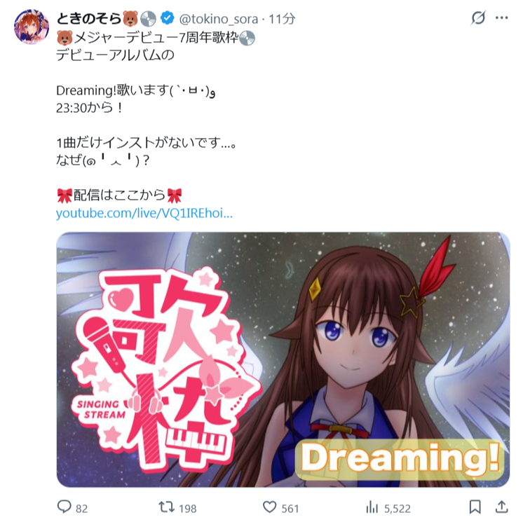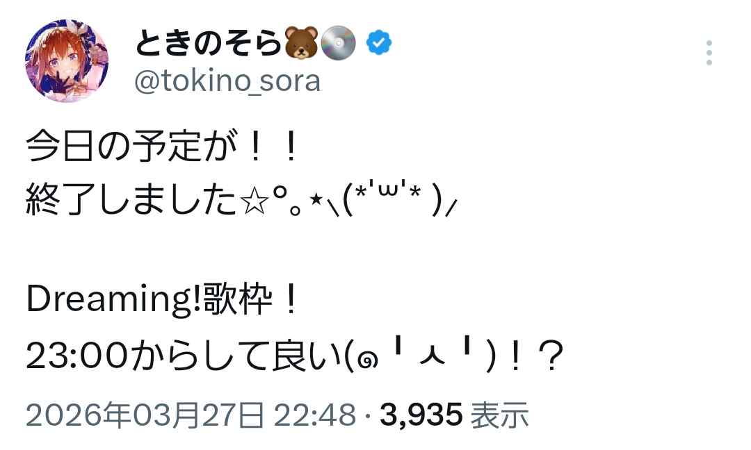 | … | 962無題Name名無し 26/03/27(金)23:20:37 IP:49.109.*(spmode.ne.jp)No.11760032そうだねx1>そらちゃんゲリラ歌枠です |