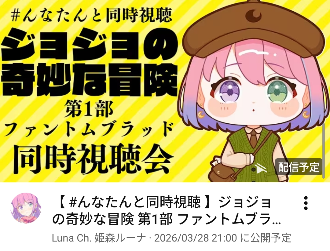 | … | 59無題Name名無し 26/03/28(土)00:28:37 IP:153.139.*(ocn.ne.jp)No.11761147+ 1774625317960.png-(1227504 B) >明日もんなたんのジョジョがあるじゃあねえか! |