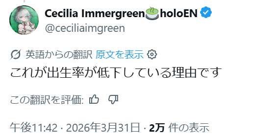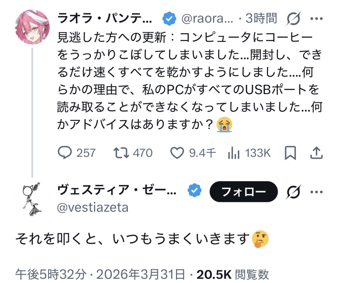 | … | 44無題Name名無し 26/03/31(火)20:28:17No.11785558そうだねx2なんか変な配信見た気がするけど30分で終わったから多分幻覚だったんだと思う |