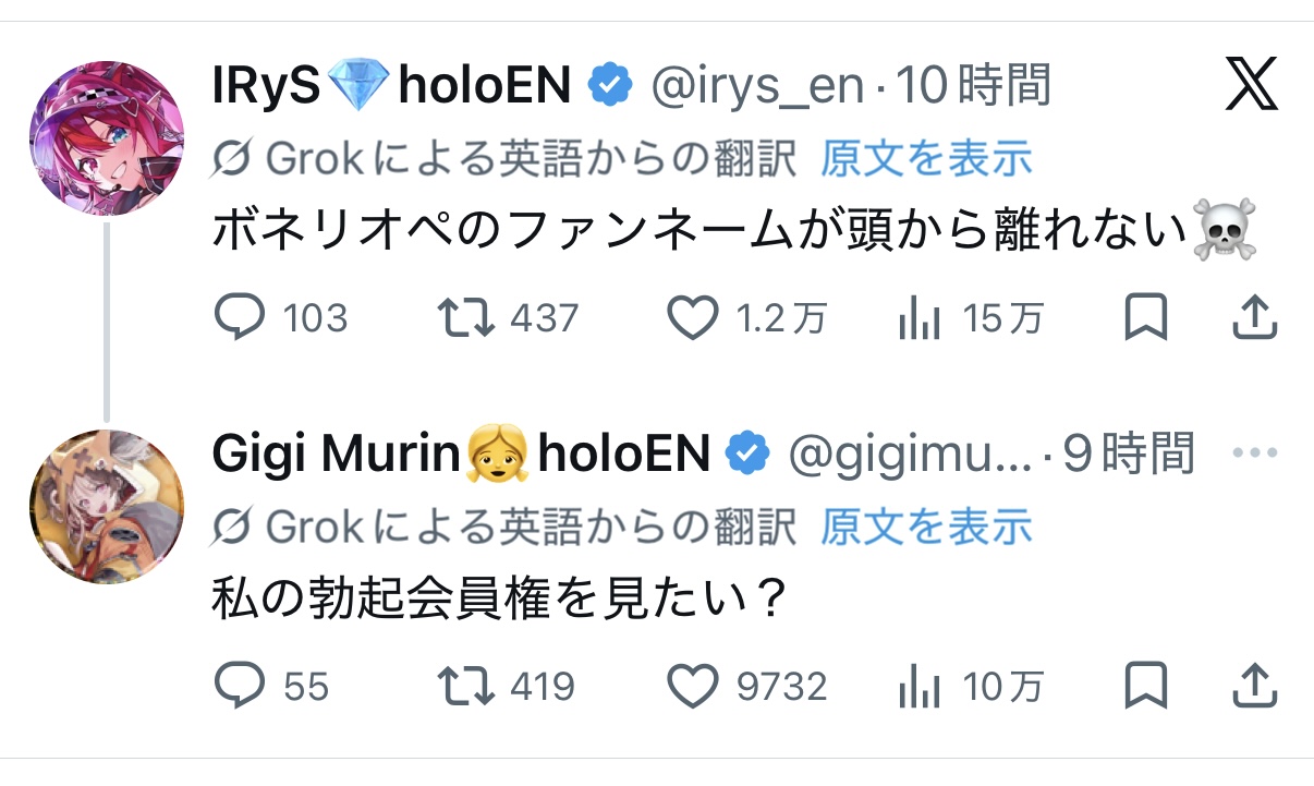 | … | 74無題Name名無し 26/04/01(水)22:28:30No.11797193+ 1775050110505.jpg-(138694 B) BONERの意味がんなっしょいな意味だからYouTubeの翻訳機能使うと最低なことになるんだけどモリカラァイオピィは知っててBONERSをファンネームにしたんだろうか |