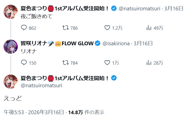 | … | 912無題Name名無し 26/03/31(火)21:03:01 IP:133.201.*(mesh.ad.jp)No.11785810+みこち枠からフワモコの待機音がする |