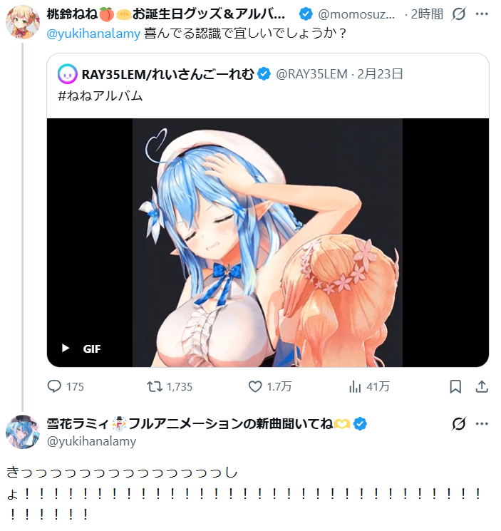 | … | 44無題Name名無し 26/04/03(金)12:54:37No.11806274+こよりのぽぅぽぅ今もろちん言った!もろちん言ったねぇ!!みたいな食いつき方すき |
