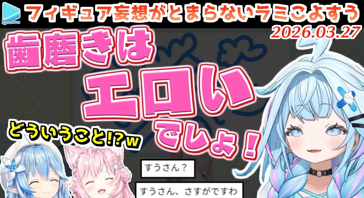 | … | 76無題Name名無し 26/04/01(水)21:35:42 IP:106.73.*(enabler.ne.jp)No.11795294+すうちゃんも歯磨きは性的と言っていた |