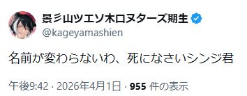| … | 950無題Name名無し 26/04/01(水)21:58:08 IP:221.118.*(aitai.ne.jp)No.11796174+次こそは!次こそは!って失敗した幹部みたいじゃん |