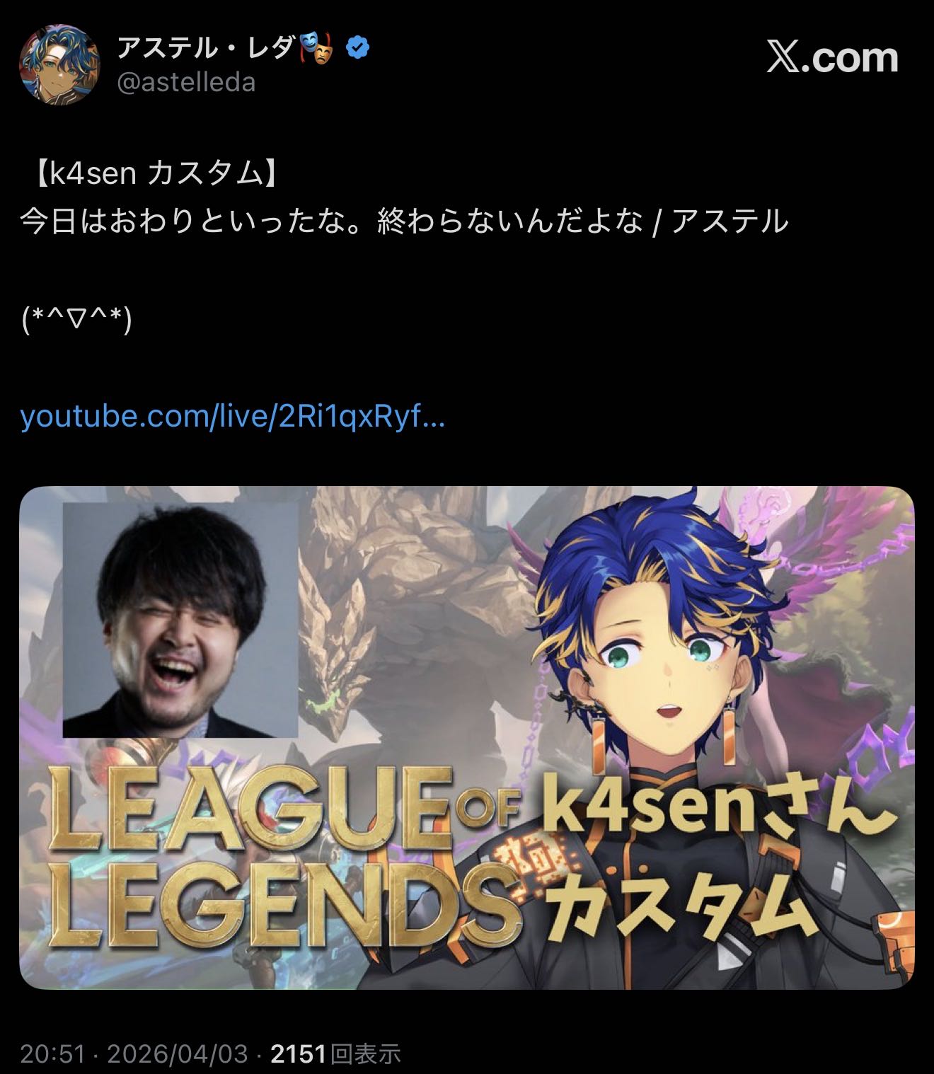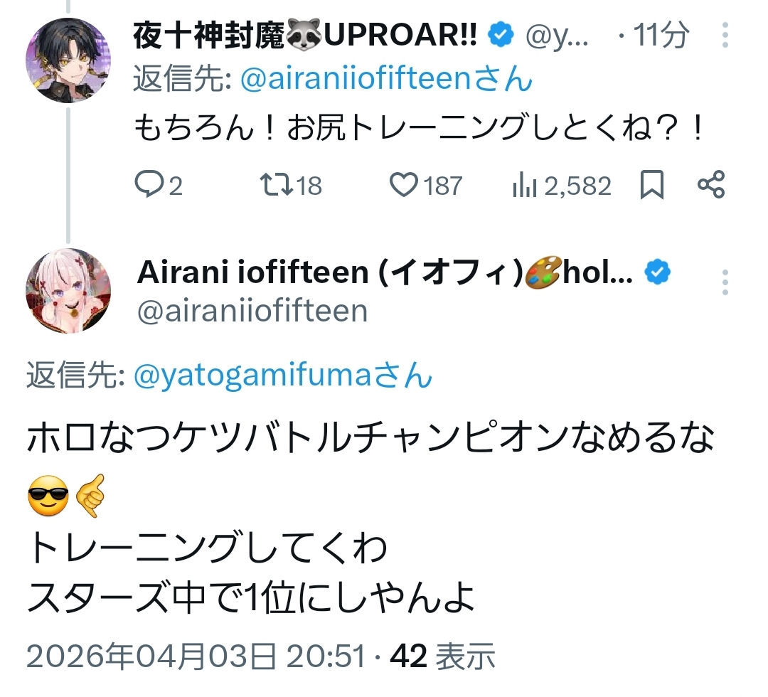 | … | 52無題Name名無し 26/04/03(金)20:11:15 IP:121.81.*(eonet.ne.jp)No.11808284+ころさん限定凸待ちの時もそうだけどこれを一切同様せず対応できるのが凄いよ |
