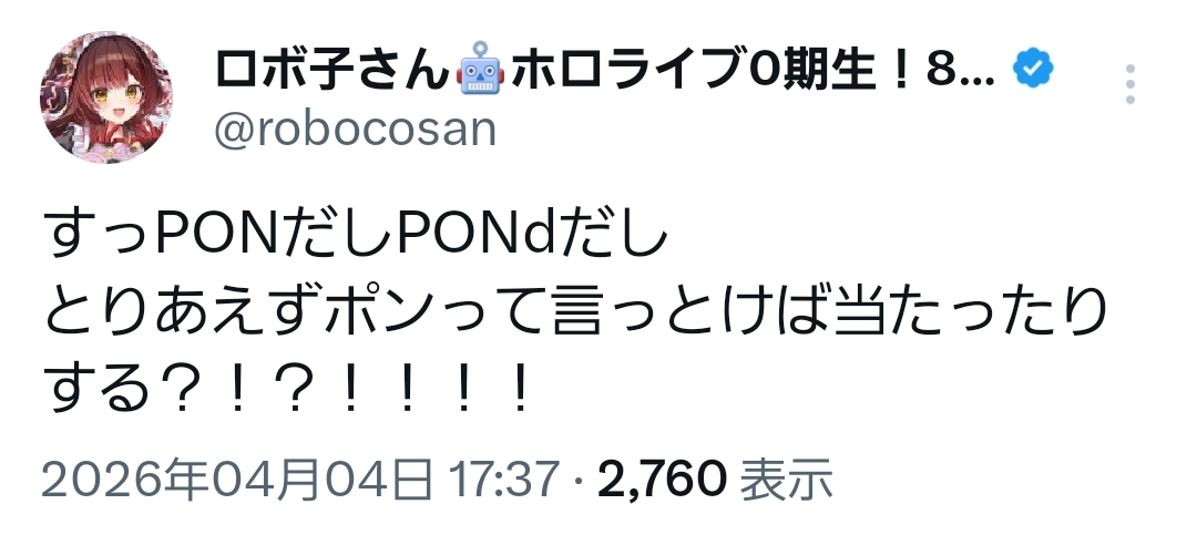 | … | 8無題Name名無し 26/04/04(土)17:17:44 IP:133.106.*(ipv4)No.11814575+いうて単語のアクセントが個性的なホロメン多くない? |