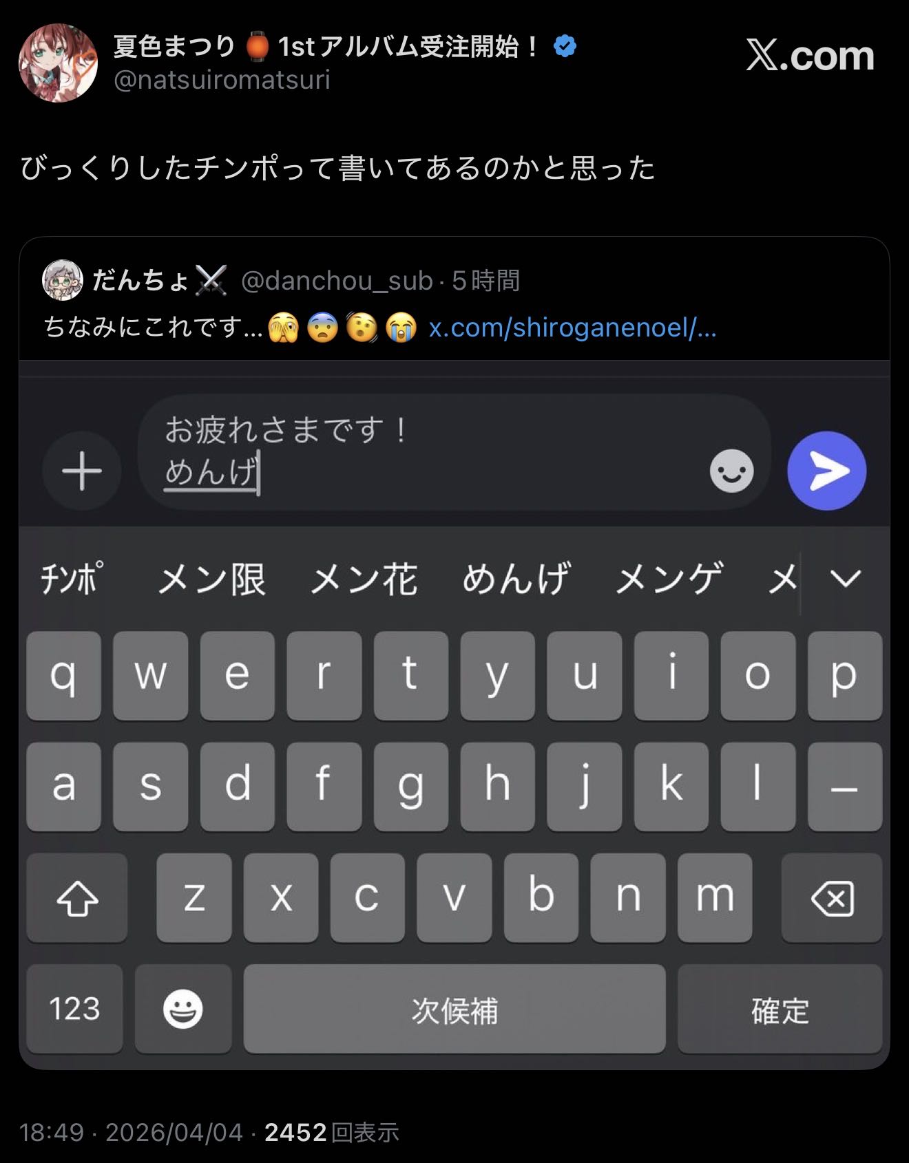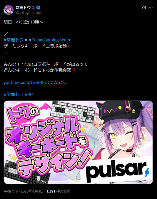 | … | 934無題Name名無し 26/04/04(土)20:12:01 IP:133.200.*(mesh.ad.jp)No.11815581+ゲストの曲とカリの曲を歌う感じか? |
