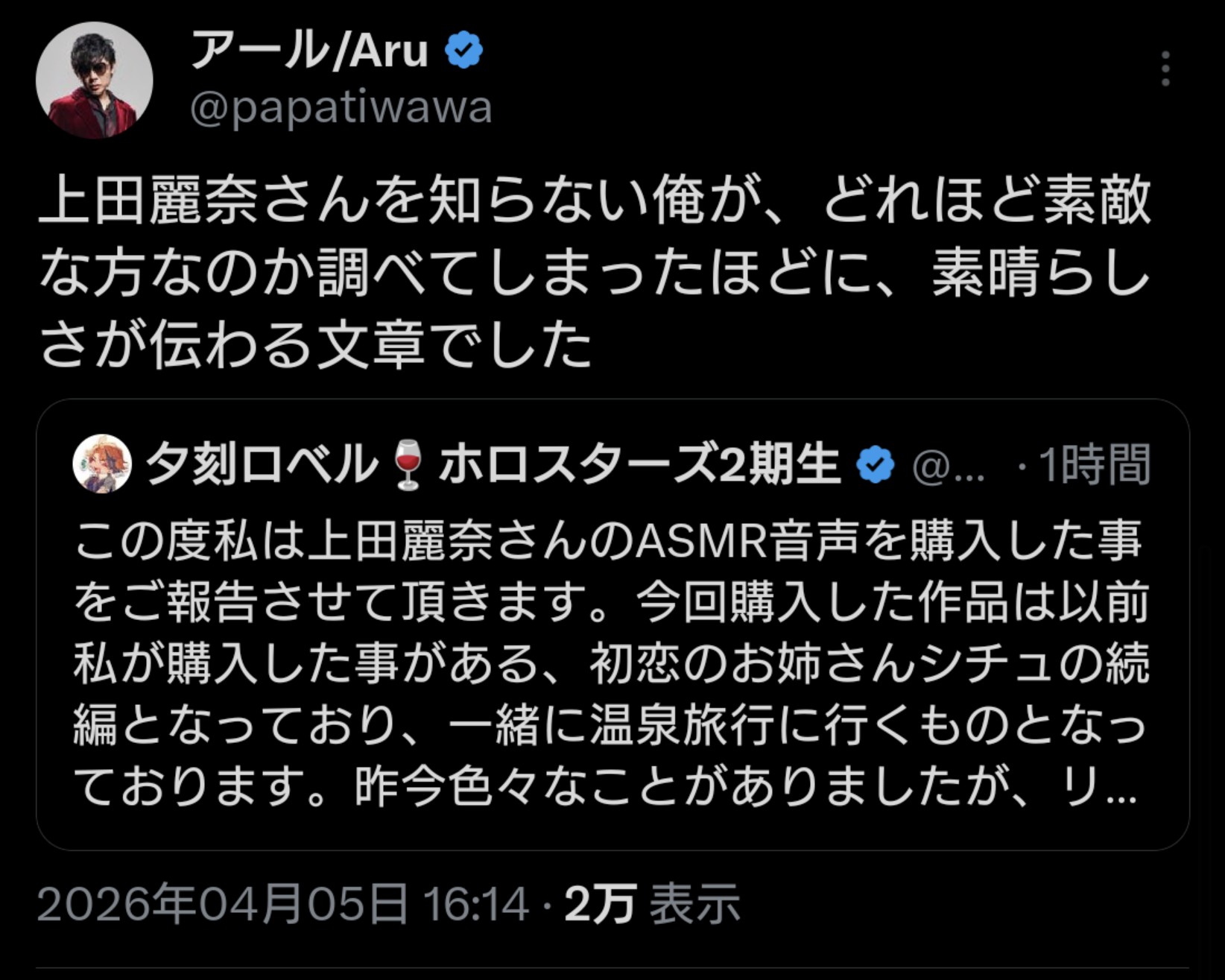 | … | 926無題Name名無し 26/04/05(日)19:00:31 IP:1.73.*(spmode.ne.jp)No.11822968そうだねx2>アル叔父の配信からねるちゃんの声がした気がする |