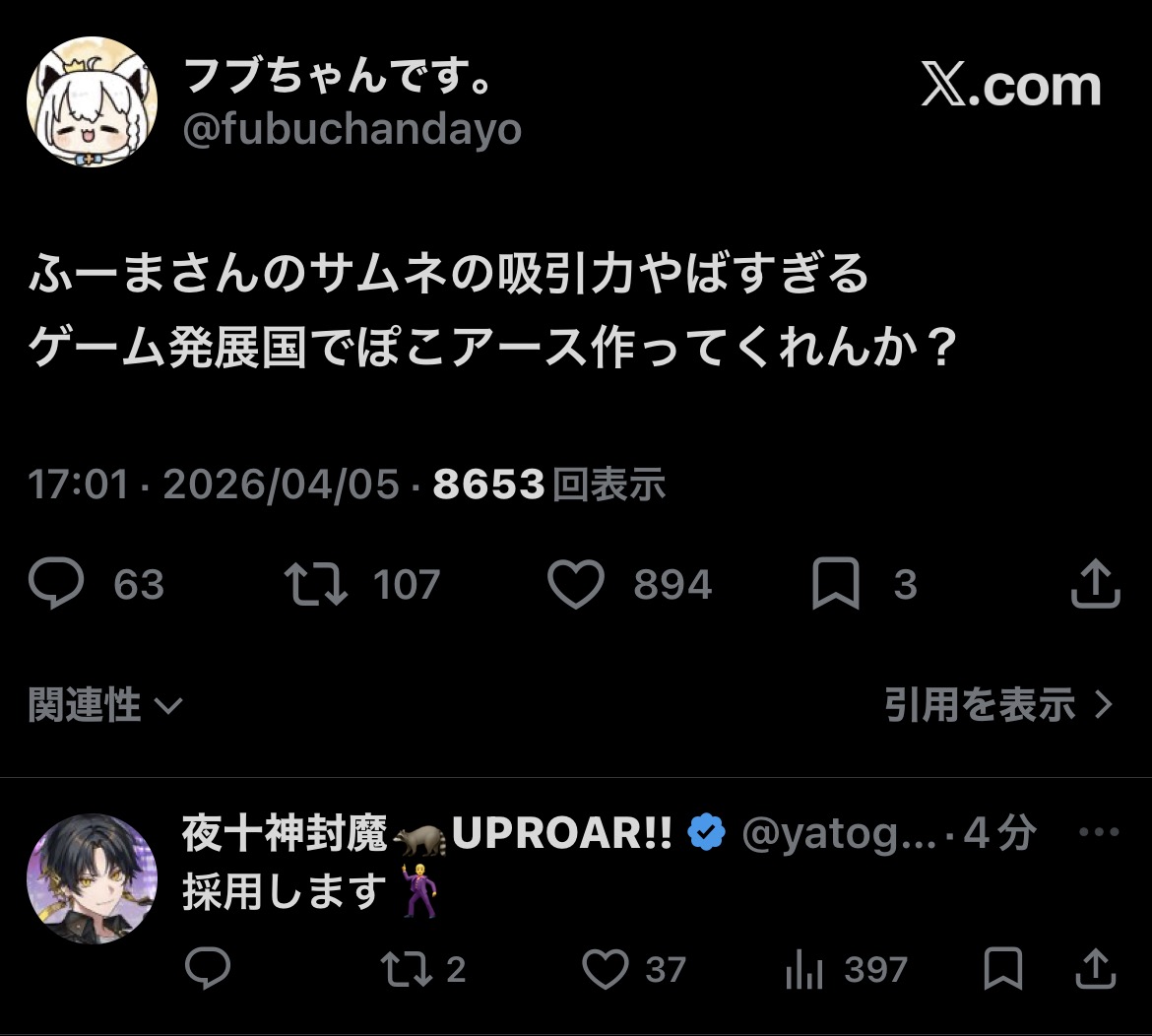 | … | 920無題Name名無し 26/04/05(日)18:57:38 IP:210.174.*(so-net.ne.jp)No.11822961+ 1775383058603.png-(508676 B) かじゅとの熱い戦いが始まる |