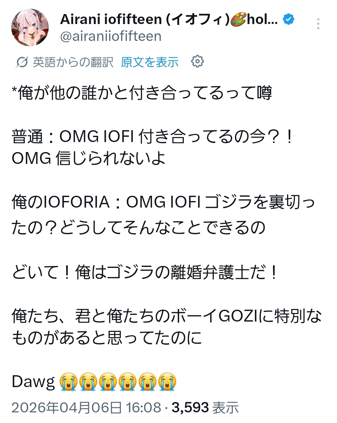 | … | 992無題Name名無し 26/04/06(月)21:07:17 IP:42.125.*(thn.ne.jp)No.11827392そうだねx1ホロプロはなあ!こんなもんなんだよ! |