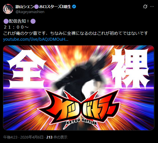 | … | 931無題Name名無し 26/04/06(月)21:04:54 IP:106.72.*(enabler.ne.jp)No.11827330そうだねx1推しがケツを出すなら俺も脱がずしてどうする by影山シエン |