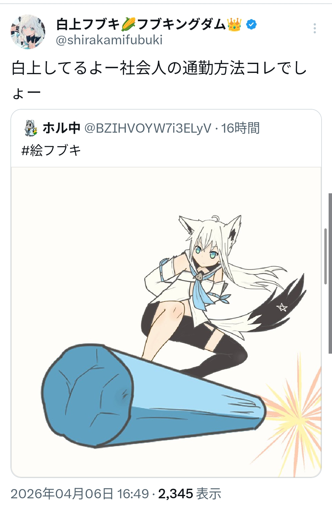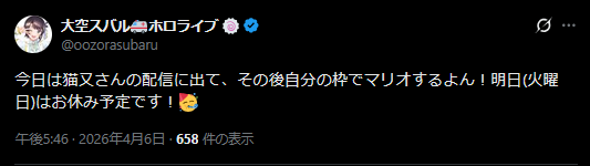 | … | 967無題Name名無し 26/04/06(月)21:06:19 IP:106.131.*(au-net.ne.jp)No.11827366+スバルホロライブ8年目 |