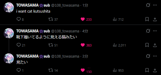 | … | 75無題Name名無し 26/04/06(月)17:45:55 IP:180.47.*(ocn.ne.jp)No.11826394+>>トワ様が靴下履いた猫を求められておる |