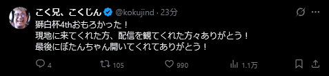 | … | 26無題Name名無し 26/04/12(日)08:12:49No.11855808+ししろんも運営も参加者も含め獅白杯一切関係ないところでこく兄が怪我をしたのでちょっと心配 |