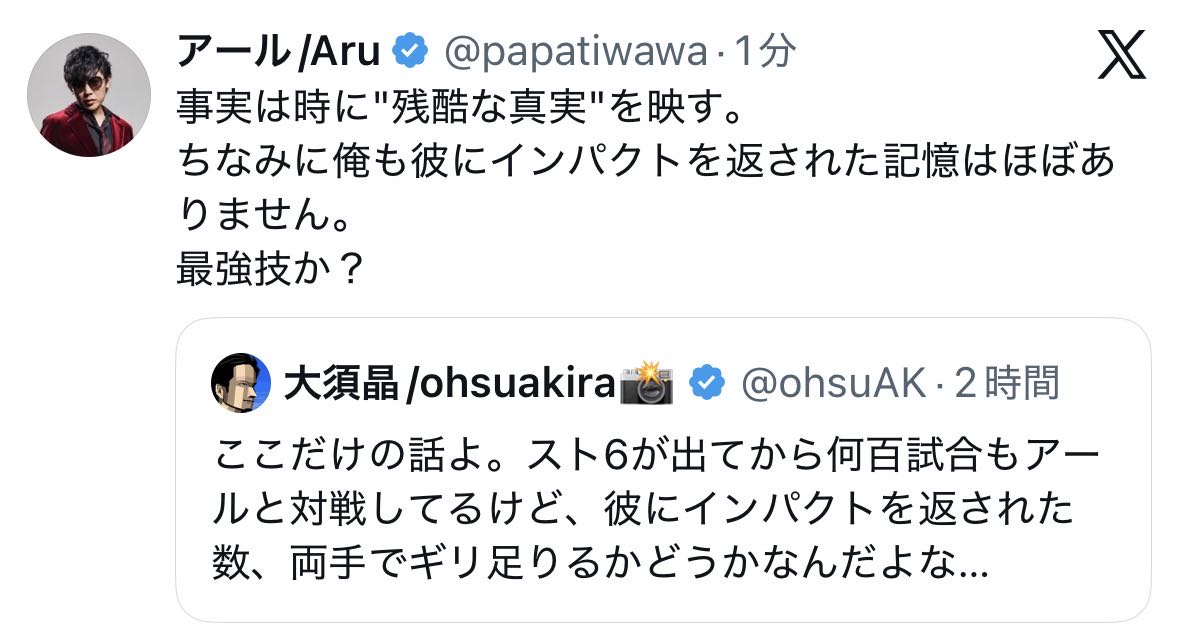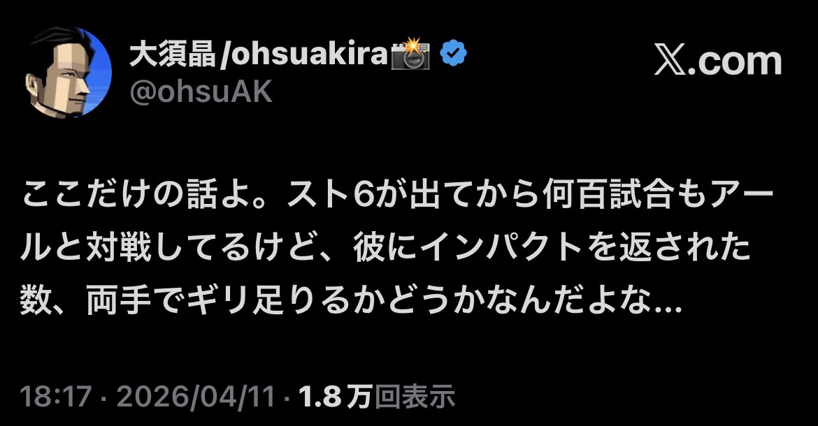 | … | 32無題Name名無し 26/04/11(土)18:06:13 IP:153.134.*(ocn.ne.jp)No.11852912+素人が格ゲー強くなることが手っ取り早いってなんだよ |
