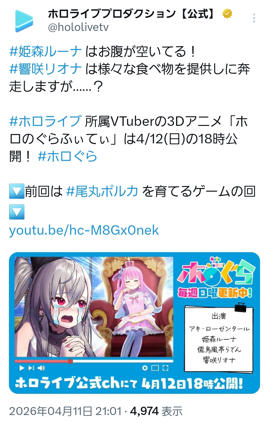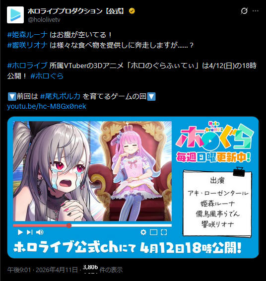 | … | 979無題Name名無し 26/04/11(土)21:12:51 IP:1.75.*(spmode.ne.jp)No.11853912+今ならホロメンはモコチャンを食うチャンス |