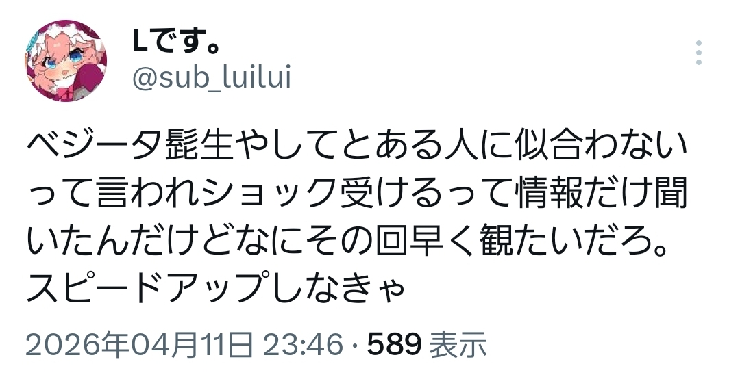 | … | 996無題Name名無し 26/04/12(日)11:06:28 IP:133.206.*(mesh.ad.jp)No.11856095+老界王神が復活した世界線のトランクスも見てみたい |