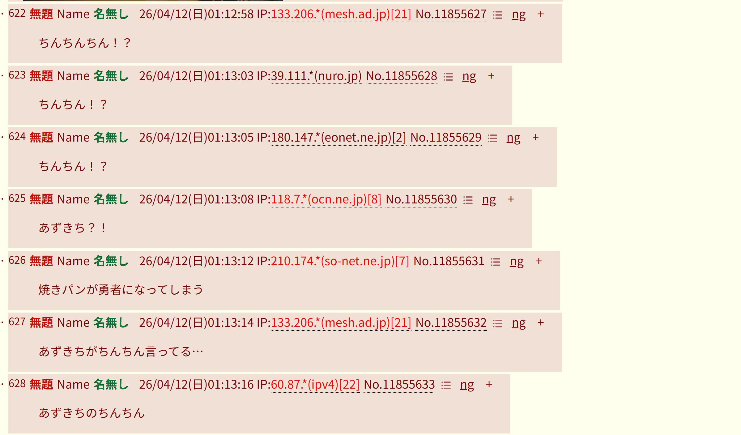 | … | 76無題Name名無し 26/04/11(土)23:39:48 IP:180.146.*(eonet.ne.jp)No.11855058+おかゆクラウドチンポビンビンです |