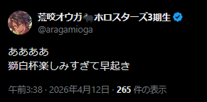 | … | 90無題Name名無し 26/04/11(土)23:41:07 IP:14.13.*(enabler.ne.jp)No.11855072+おかゆんめっちゃテンション上がってて笑う |
