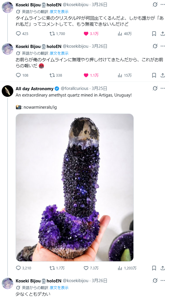 | … | 933無題Name名無し 26/04/12(日)10:37:05 IP:122.133.*(mesh.ad.jp)No.11856013+>こよちゃんも地味に下ネタ好き疑惑あるからな… |